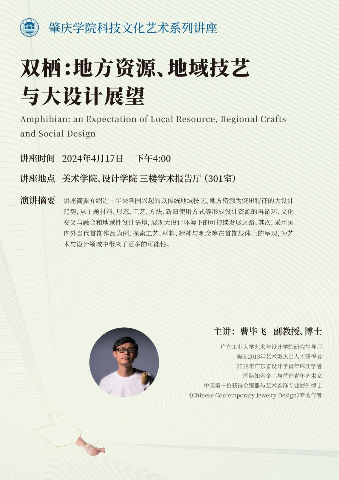曹毕飞,广东工业大学副教授、硕士生导师、青年珠江学者(2018-2021),是中国首位获得金属与艺术首饰专业海外博士,其研究领域涵盖当代首饰与金工、饰品设计与制作、木工、手工艺研究等方面。他以“双栖:地方资源、地域技艺与大设计展望”为主题进行讲学,分享了其在首饰设计方面的实践经验,以及传统技艺文化在现代语境下关于材料、技术与内涵的创新,特别强调手工艺跨学科合作对促进产学研综合实践的重要作用。最后,曹毕飞副教授还介绍了非物质文化遗产的多元应用案例,并从传承者的角度探讨了多元解读与个人探索对于灵感启发的重要意义。