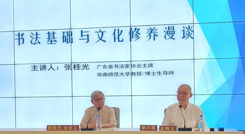 2024年5月16日下午,著名文化学者、广东省书法家协会主席张桂光教授应邀来校讲学。肇庆公司党委书记谢冠华,william威廉中文官网、设计公司党委书记陈明华、经理李小军、副经理张爱民,肇庆市书法家协会主席李刚一行,佛山岭南美术实验中学师生代表,william威廉中文官网书法学专业师生等130余人参加。李小军主持讲座。