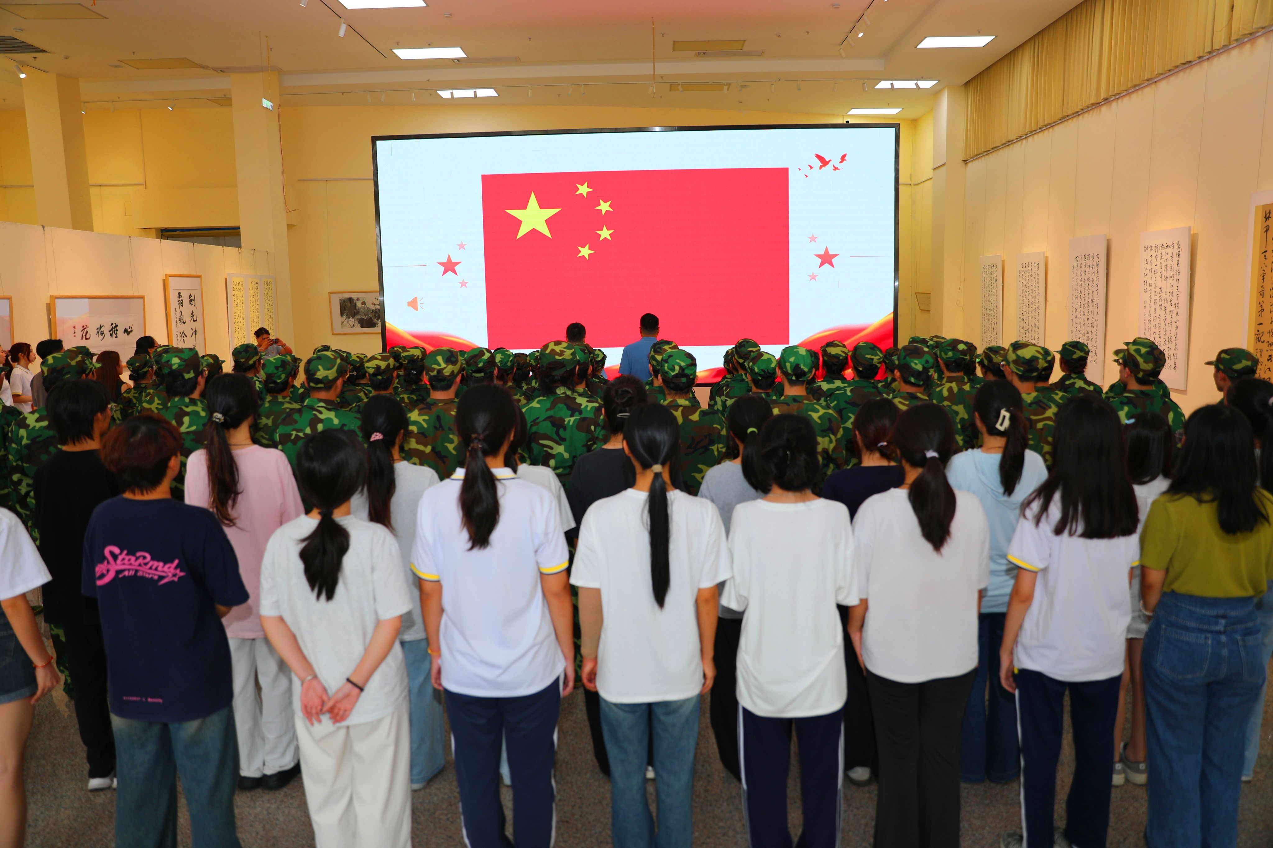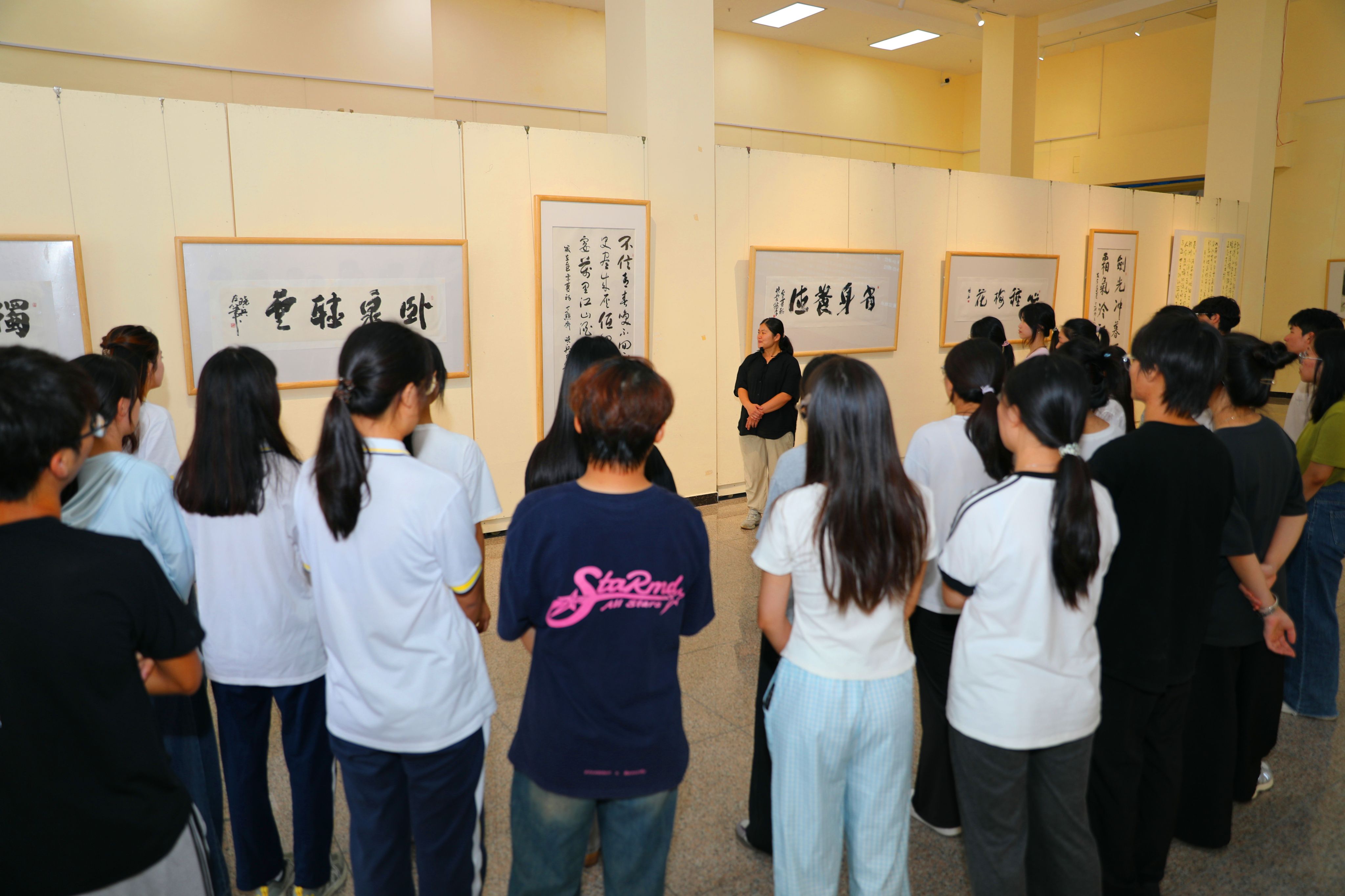 聘任仪式结束后,师生们在美术馆讲解员的带领下,走进红色主题书画展展厅。一幅幅主题鲜明、意境深远的作品,将革命历史、英雄事迹与艺术创作巧妙融合:有的以浓墨重彩描绘抗日战争时期军民浴血奋战的场景,有的用细腻笔触勾勒新时代军人保家卫国的英姿,还有的以书法作品书写 “天下兴亡,匹夫有责”“犯我中华者,虽远必诛” 等铿锵语句,每一笔、每一划都饱含着对祖国的赤诚与热爱。