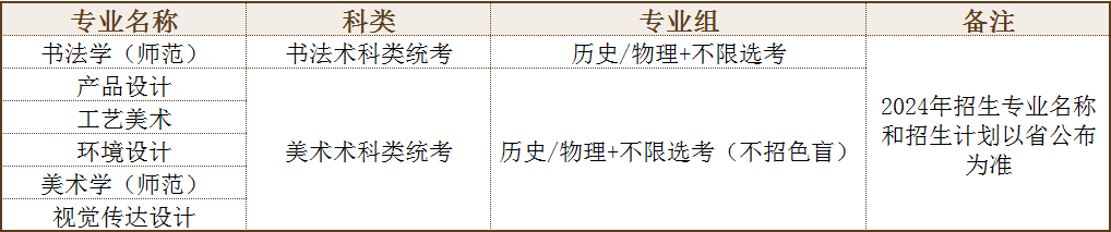 目前设有美术学、书法学、视觉传达设计、环境设计、产品设计、工业设计、动画、工艺美术等8个本科专业和1个设计硕士专业。