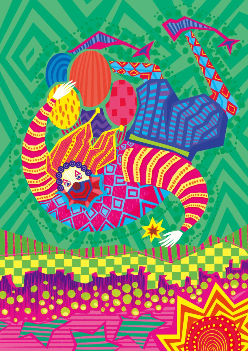 《小丑家族》以小丑故事为背景,绘制了小丑们迷惘、憧憬、欢乐、梦幻等奇妙场景,采用装饰性的色彩视觉和有趣的构图叙事,是古怪和创新的组成。作品采用手绘加鼠绘,在高饱和度和鲜亮色彩中突出插画人物的存在感。