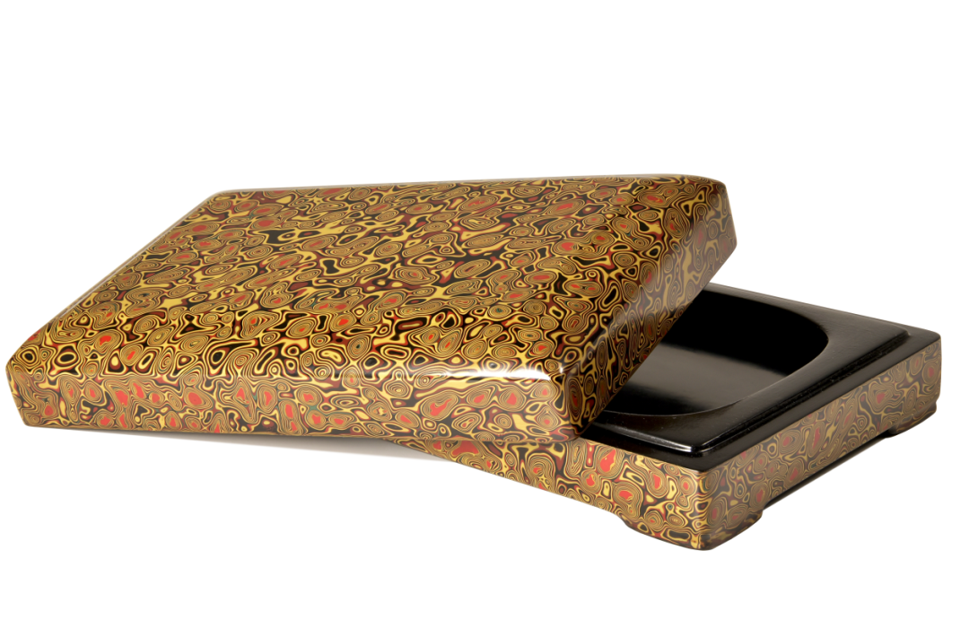 《木胎犀皮纹漆砚盒》以木为胎骨,以漆作饰纹,施以典技,借古为新,制漆之砚盒,常以砚为伴。