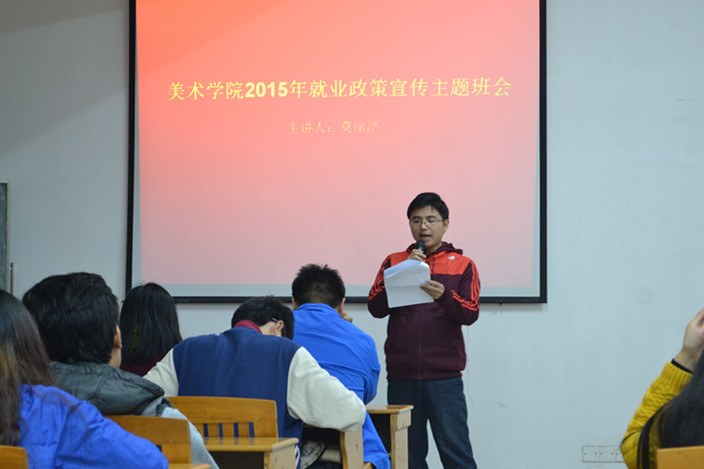 首先,由莫岸洪老师向同学们强调了老员工做好职业生涯规划的意义与重要性,然后对国家与广东省关于老员工应征入伍、毕业生求职的政策做了宣读和解释。他分析了美术生的就业现状与就业前景,说明美术师范生大多数毕业后没有当老师,而是进入企业或者自己开办工作室去创业,告诫同学们要开阔思维,灵活就业。他提醒老员工要从一年级开始学好专业,打好文化知识的基础,要及早发现自己,了解自己,明确自己的奋斗目标,然后不懈努力。