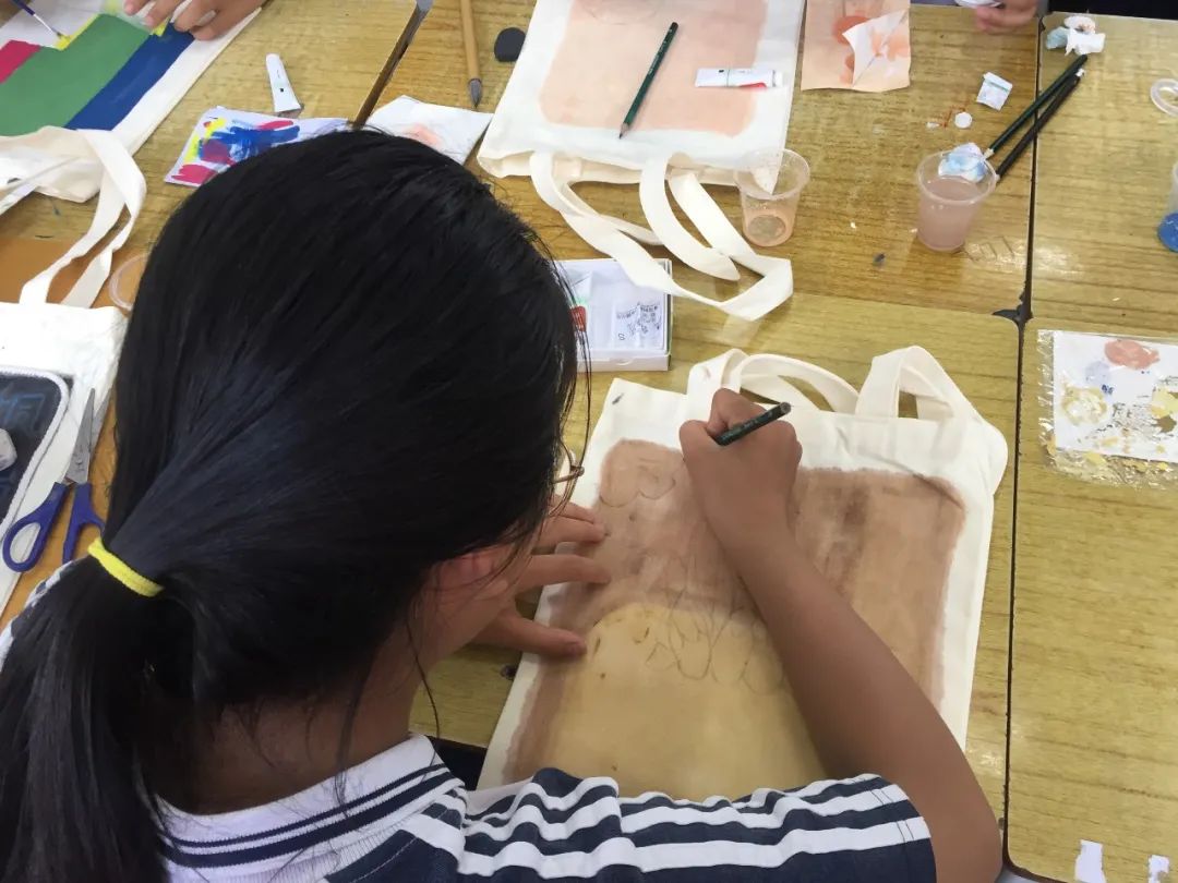 有了衍纸手工画的创作经验,员工们对“棉绳手工画”显得格外自信与熟捻。在老师介绍棉绳手工画的创作过程及注意事项后,大家不仅迅速地完成了帆布袋上的画稿,还能得心应手地运用棉线材料进行粘贴,并使用纺织颜料进行上色。
