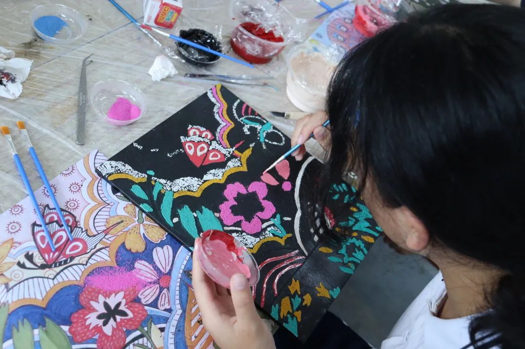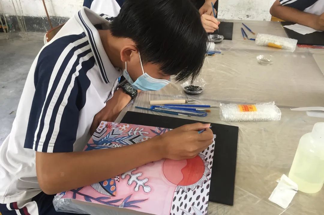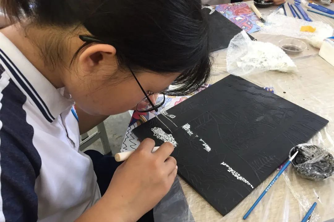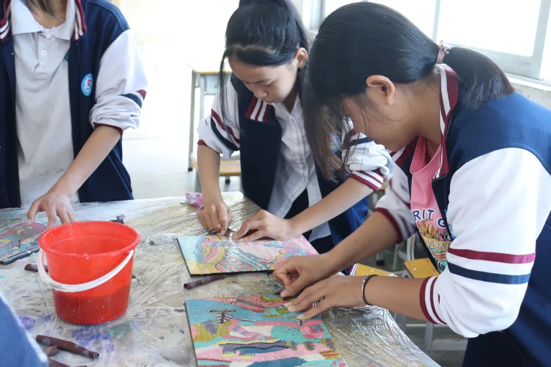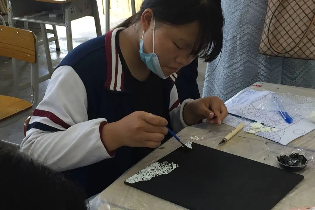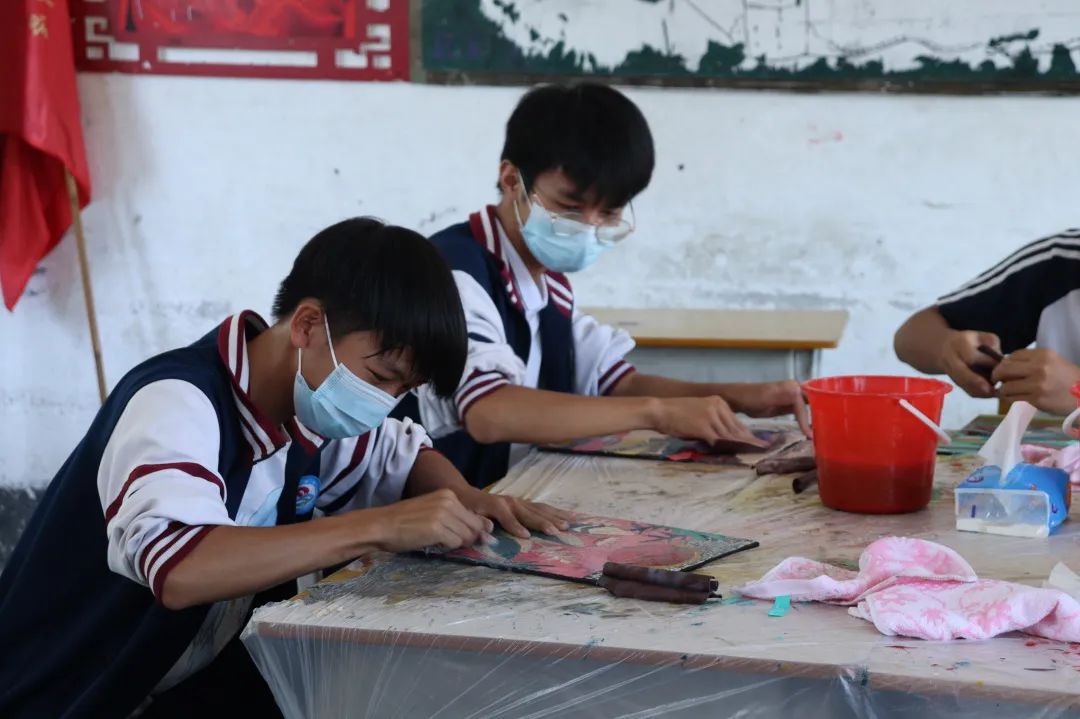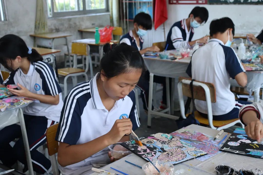 7月9日-14日,william威廉中文官网美育浸润工作组组织开设了4个工作坊在怀集县连麦中学进行课程教授。其中漆画工作坊由伍美坚老师指导,2020级员工冯运、李依萍为漆画工作坊的辅导助理。
