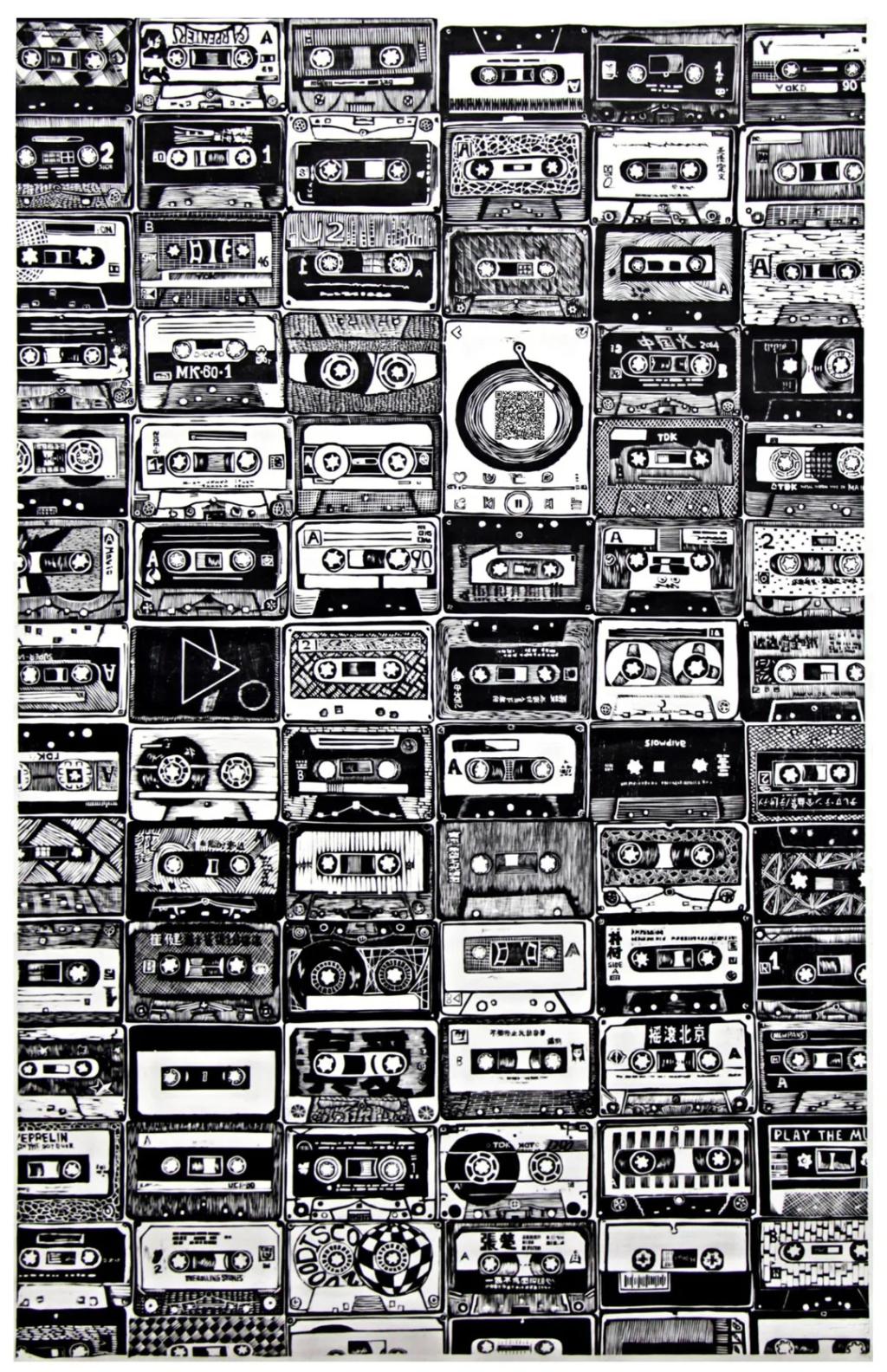 李雯 《摇滚青年精神载体》 黑白木刻 92×147cm 2020年