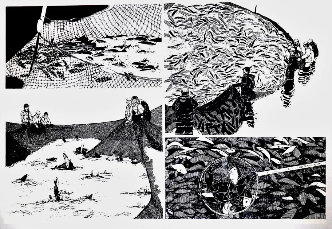 冯雪易 《一网鱼虾 一网粮》 黑白木刻 185×124cm 2021年