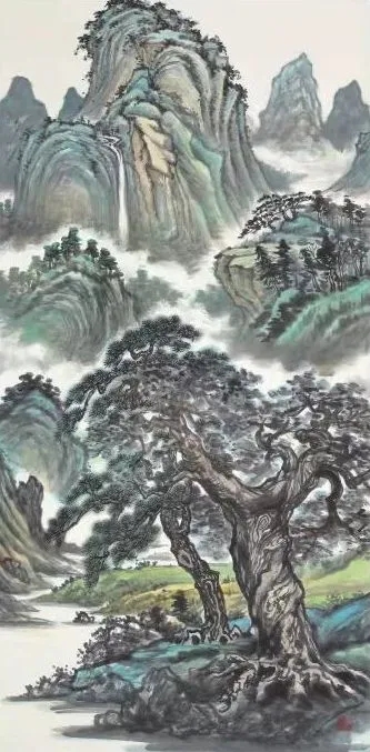 绵绵秀美的峦头,细细堆叠的松针,在梁善笔下,明清的薰风轻轻袭来,这种久违的古雅,令人如饮醇醪,惬意舒适。与当今许多过于视觉冲击的作品不一样,他坚守着岭南的绵密明快,他的青绿,用得恰到好处,增添了画面的轻松之感。而山水之间的空间处理,也在古法中别开自己的生路。他也在古典题材之中尝试突破,《连理》中的奇特远山和打破平衡的前景,就是一种有益的尝试。他在不同的作品中都有这类的突破,观众细看自能感受。