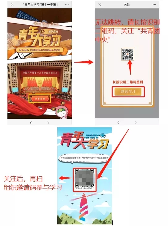 温馨提示:如点击“继续学习”后,系统仍无法跳转参与学习,请长按识别图中二维码关注“共青团中央”公众号后,再扫描组织邀请码参与学习。