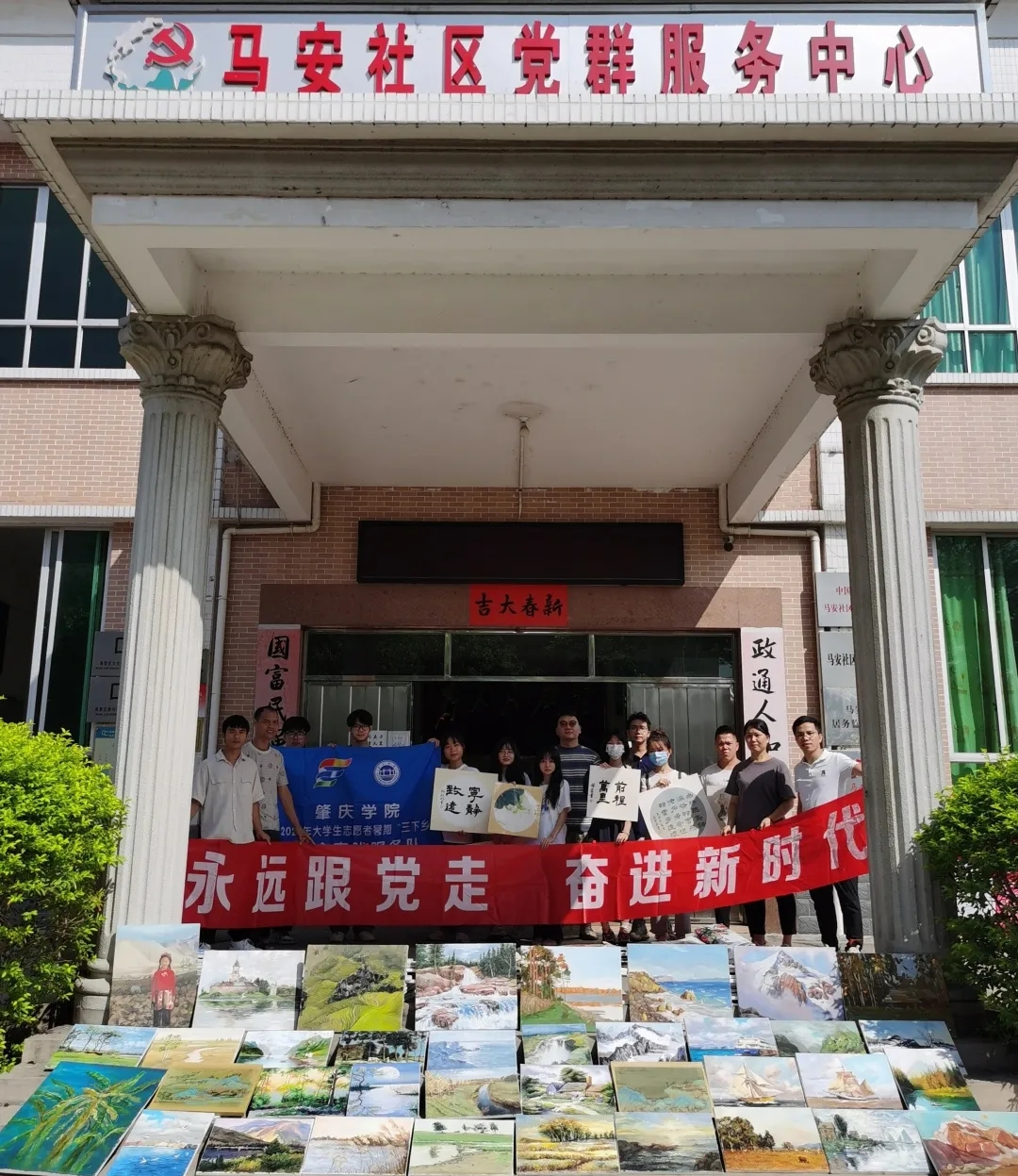 新农村建设志愿服务队指导教师及队员代表将作品赠予马安社区村委会,向村民们介绍画作,展现美院学子的青年担当,汇聚青春力量,表达了利用所学专业知识服务乡村,建设乡村美好家园的美好愿望。