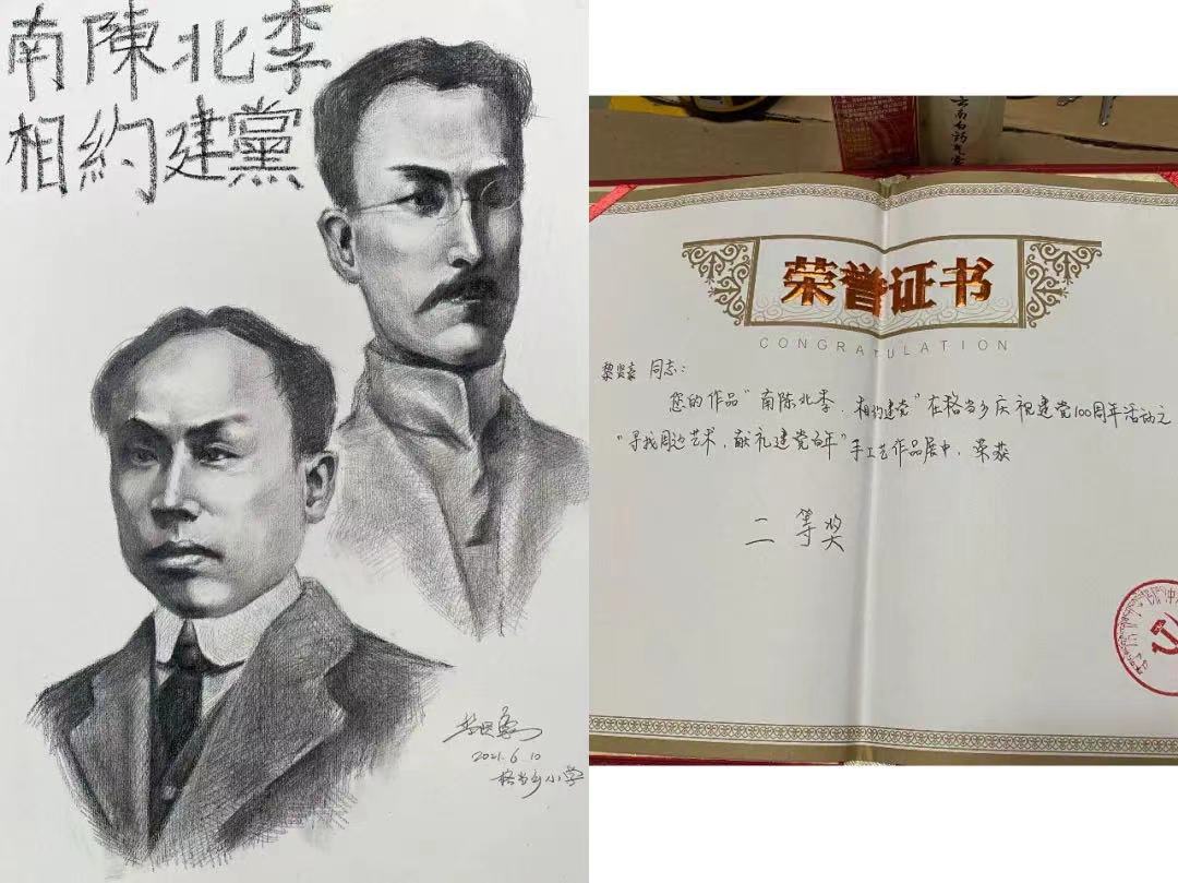为庆祝中国共产党成立100周年,格当乡政府举办了“寻找周边艺术,献礼建党百年”的手工艺术作品展览,我的作品《南陈北李,相约建党》在此次活动中荣获二等奖,我感到非常高兴,能够在这个盛大的节日里用作品表达对党和人民的热爱!