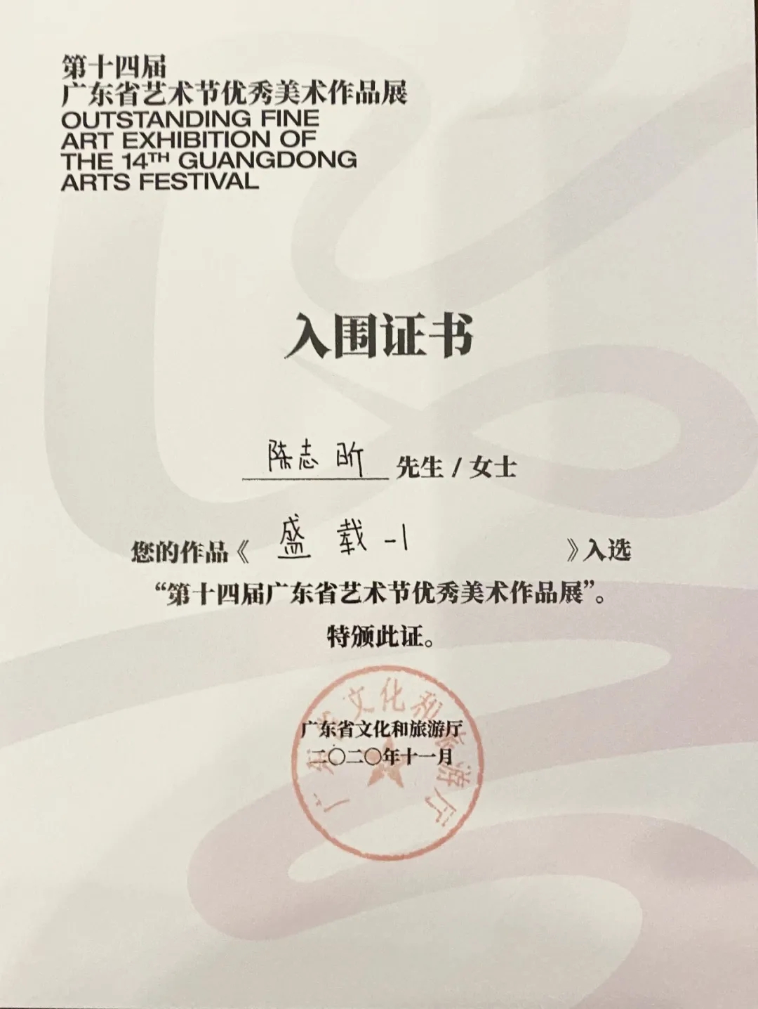 近日,由广东省文化和旅游厅主办,广东美术馆承办的“第十四届广东省艺术节优秀美术作品展”在广东美术馆顺利开幕!公司青年教师陈志昕版画作品《盛载-1》从参赛的493件作品中脱颖而出,成功入选!