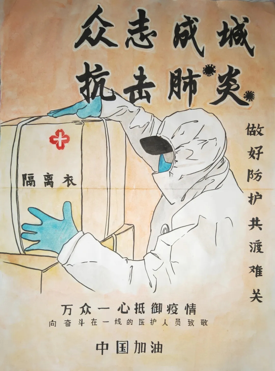 创作感想:自“战疫”打响以来,有数不清的医护人员仍义无反顾的走向“黑暗”。有的医护人员不幸牺牲,还有源源不断的人加入到这场战疫前线。这些人我们将永远铭记于心,同时我们也在后方坚守阵地,勤洗手,戴口罩不聚集。与他们一同战斗!相信不久的将来,这场“战疫”将会获得胜利!