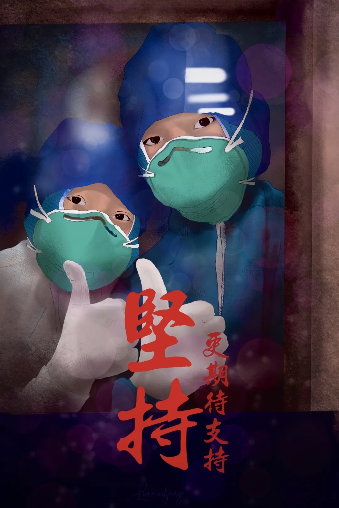 创作感想:在全国抗疫的战斗中,冲在我们前面的是白衣战士,他们用忘我的精神救治重症患者,在面临可能会被感染的情况下,依然坚守在第一线,当理想,飘扬在一线战场;当逆行者奔忙,千万里万众守望;当温暖的呐喊,在耳边回荡;当英雄倔强,誓击倒病毒的狂;时间狠狠刻下人类伤疤和彷徨,也记录那勇敢的成长,不惧黑夜长,信念作火光,定有春暖花开!等你们平安归来!