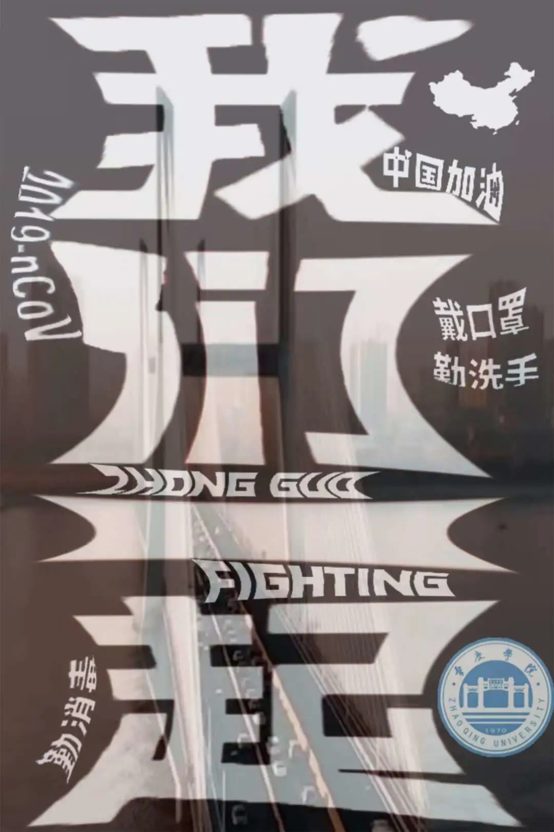 创作感想:运用武汉长江大桥作为背景, 代表的是为武汉加油!“我们一起,团结抗疫”这八个字与背景的结合,是为了更好地为武汉鼓励!主题字中也附有副题字:“勤洗手,戴口罩”是为了更好地加强对疫情的防控;“2019-nCov,病毒,+”是运用简字简形的方式来说明防控的这一病毒。设计的整体结合是为了加强呼吁做好防疫;同时为武汉加油!为中国加油!