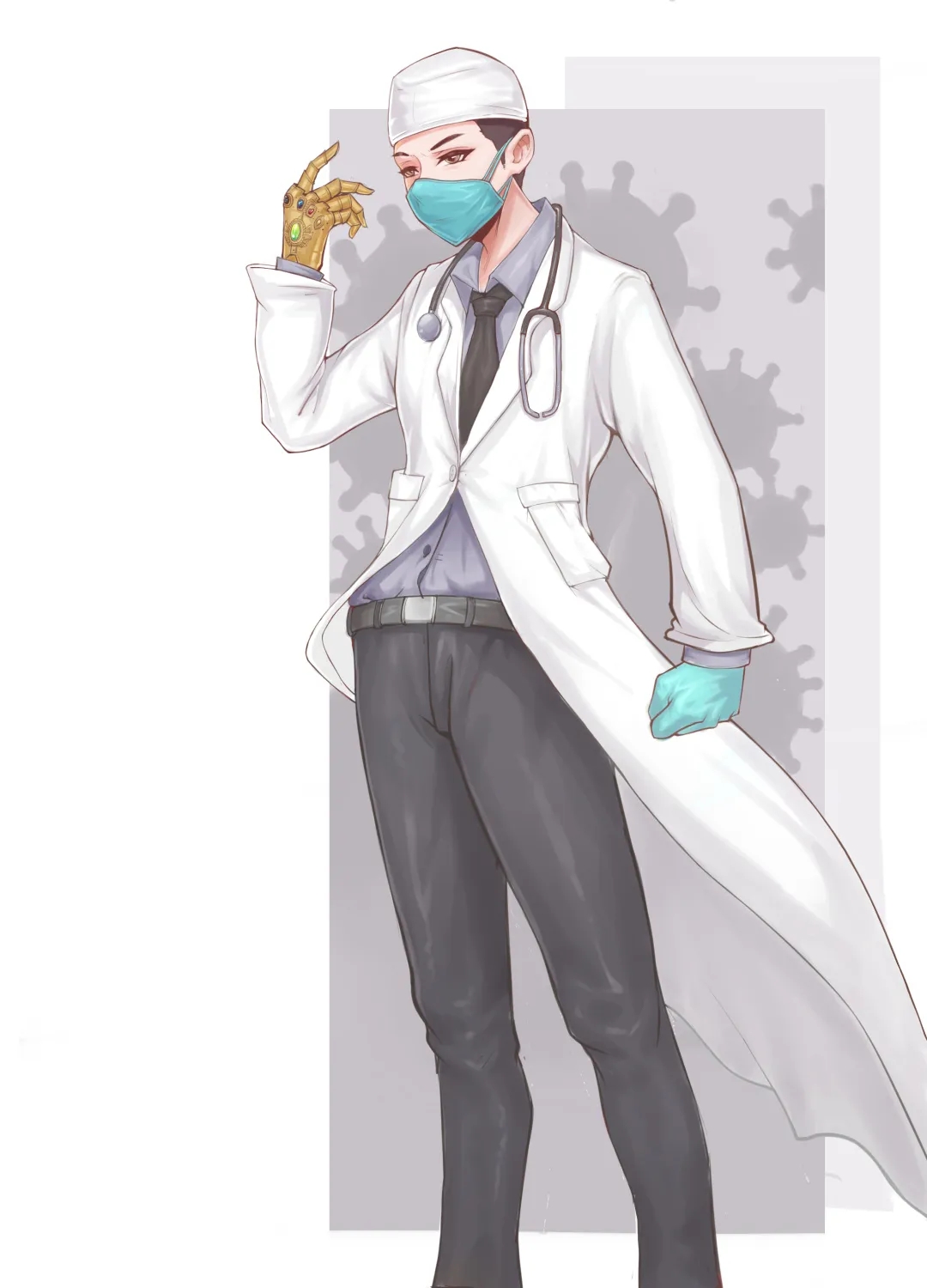 创作感想:这是我为这次疫情所创作的一幅作品,我把它命名为《无限可能》。这幅作品主要以医生为元素,因为医生在这次疫情中充当了绝对的主角,这副作品所表达的亮点就在这名医者的手上,他的右手戴的并不是手术手套,而是大家“复仇者联盟”里灭霸的无限手套,这只手套的能力十分强大,它可以毁灭地球,也可以拯救全人类,虽然灭霸利用它险些毁灭地球,但是钢铁侠最后则是利用它拯救了地球,同时牺牲了自己。而正在武汉一线奋斗的所有医者们,都和钢铁侠有着同样的想法,那就是想灭病毒,拯救人类,哪怕是牺牲!。因此我把无限手套放到了这位医者手上,希望他们能早日消灭病毒,身体健康,致敬医者。