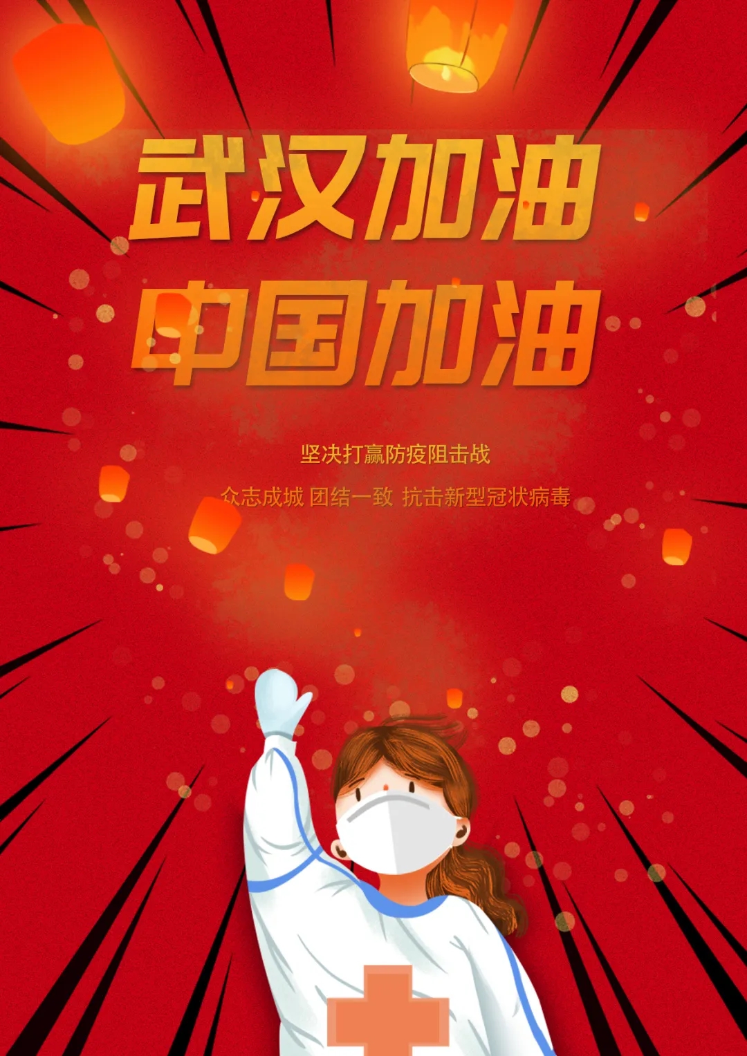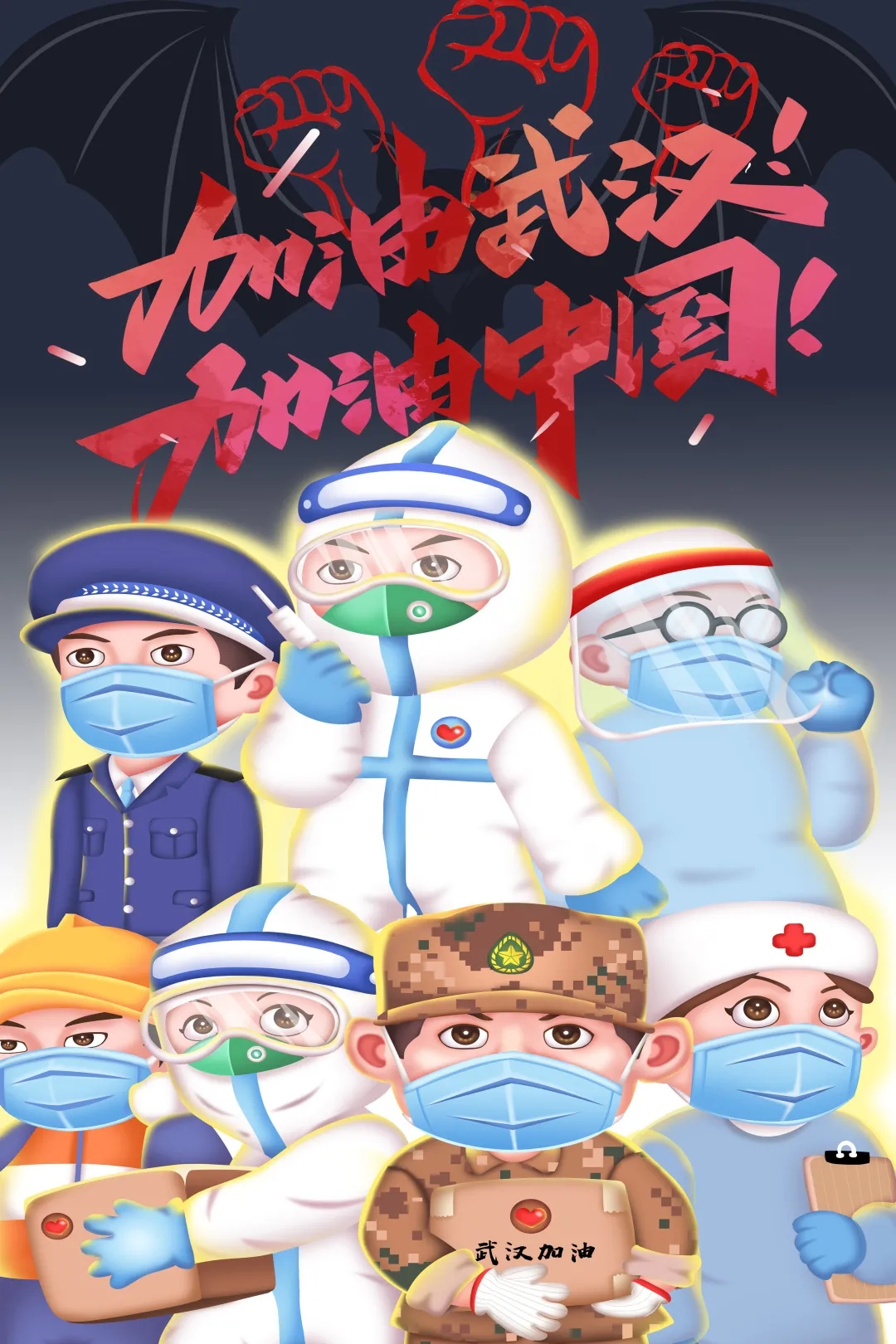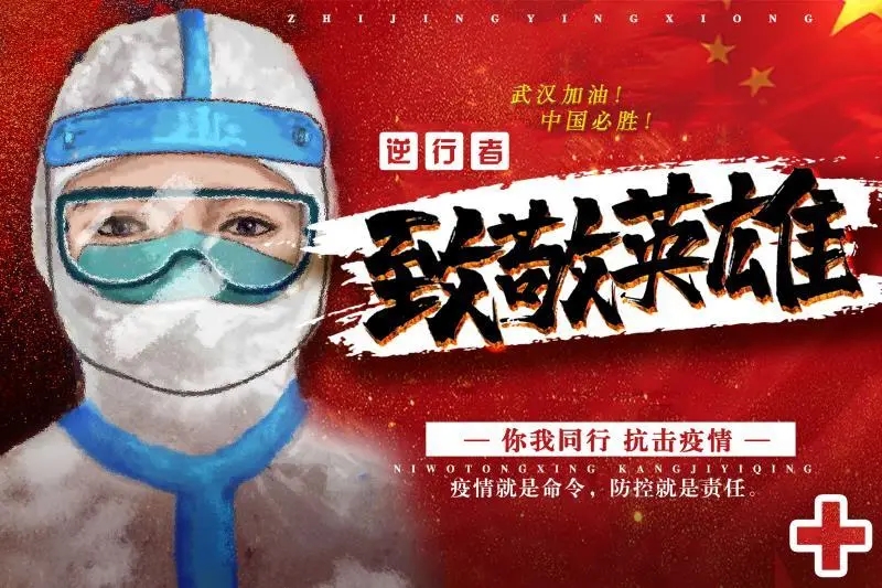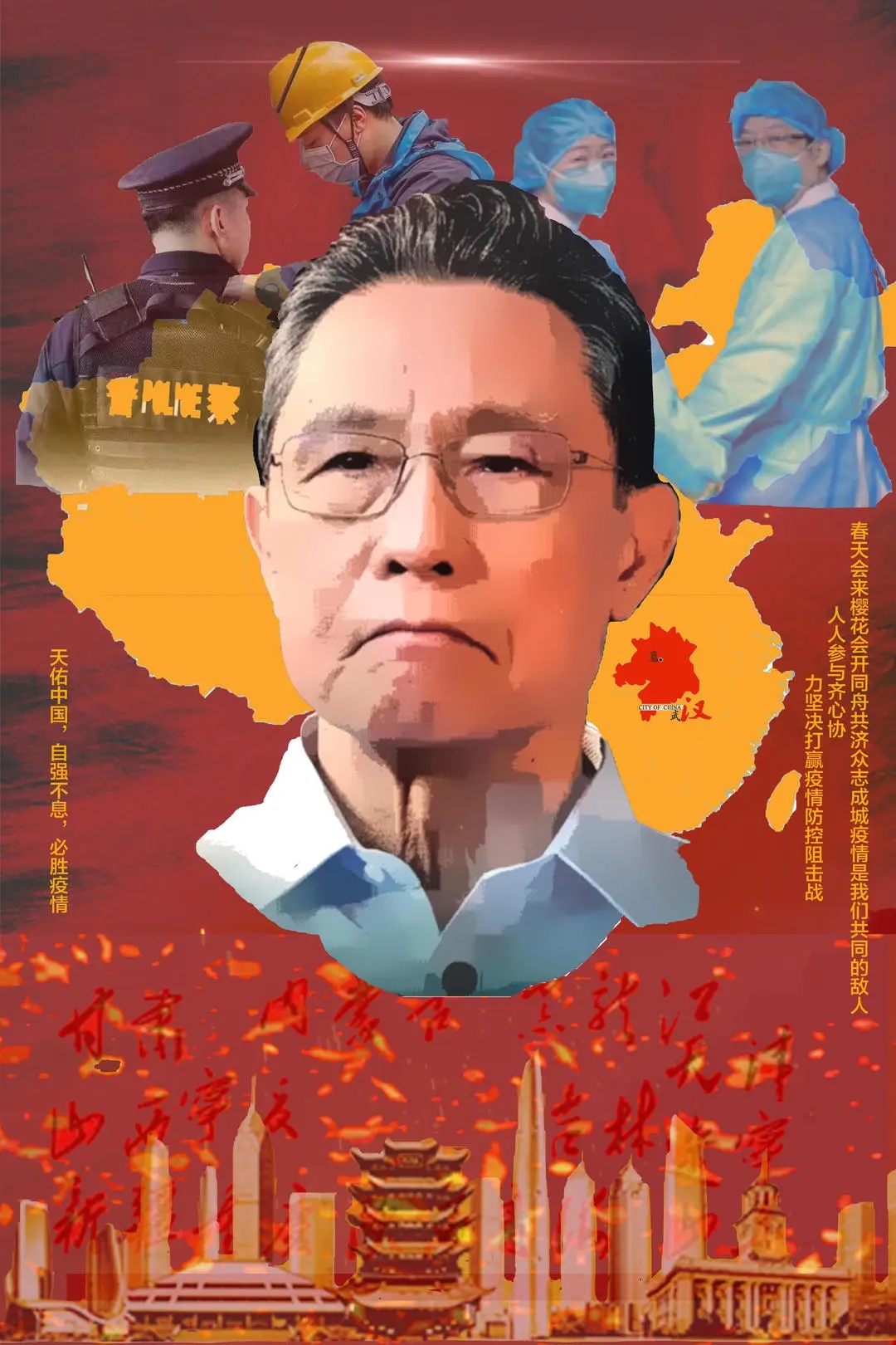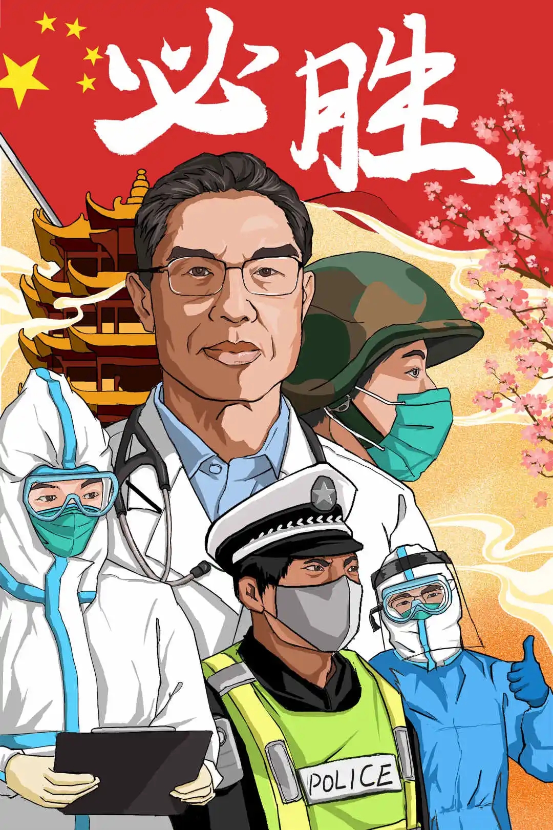 创作感想:作品赞美了在疫情一线的部分英雄代表,由钟南山专家带领医护人员、军人、党员、警察等人民竭力奋战。突出钟南山的重要性也表现了医护人员与军人、党员的作用。红色的国旗在飘扬,表达了国家对疫情的有效处理和贡献。整体作品采用橙红的色彩,表达了中国人民振奋人心、坚持不懈的鉴定意志。配有背景黄鹤楼、樱花则提示了武汉,表达对武汉的重视。主题及文案表达了可以战胜疫情的美好愿望。