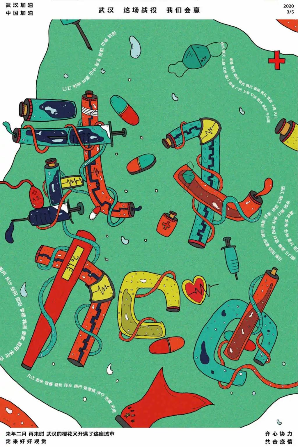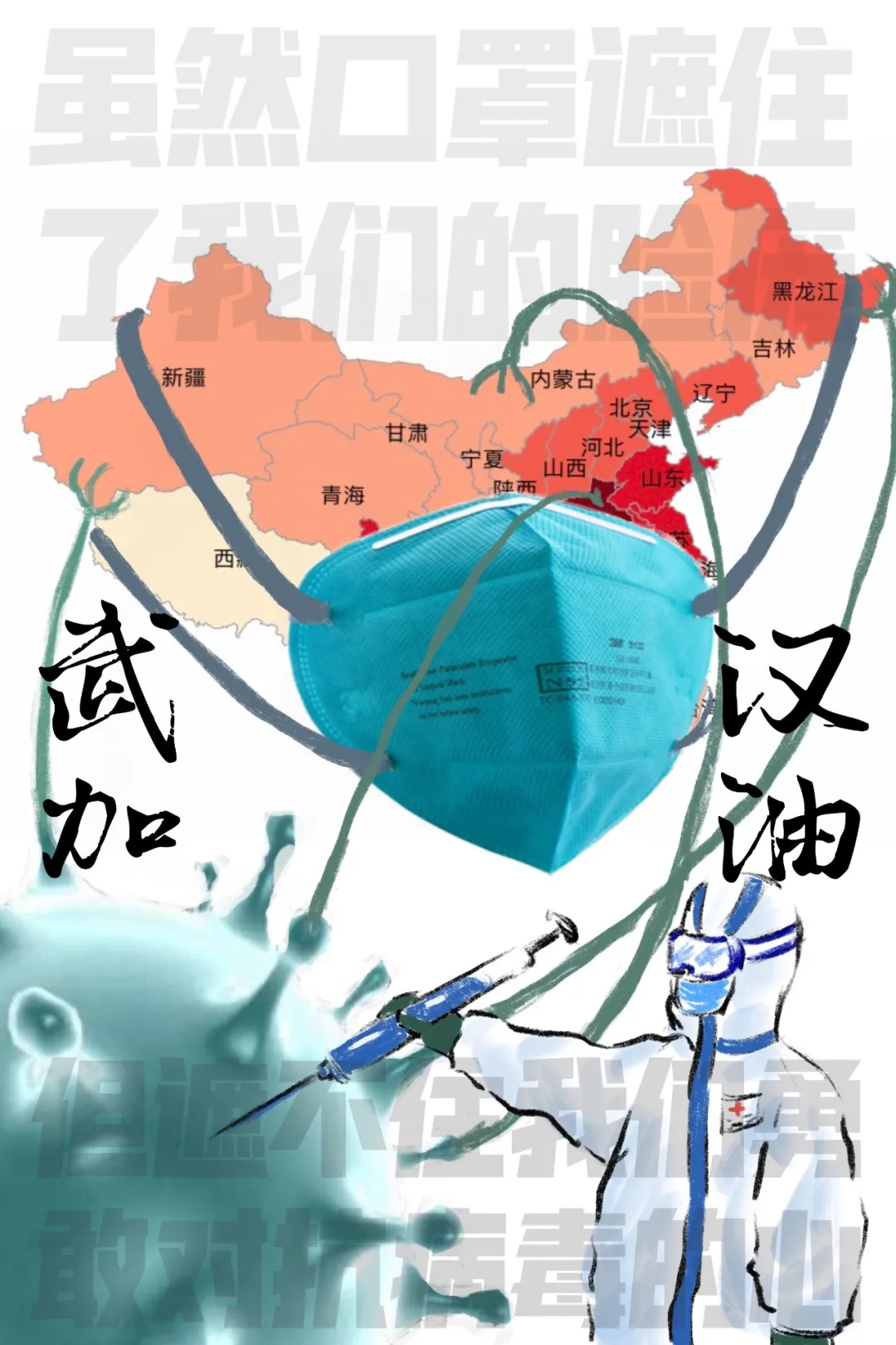 创作感想:围绕着“艺术战疫”这个主题,将武汉加油四个字进行了字体变形,用医疗设备替换掉笔画,并使成为整个海报的中心,加强整体视觉效果。整体配色上用了主要为和医疗设备相关的颜色。在字的周边加上了别的城市的名字,让画面主题的凝聚力更增添几分。我用海报的形式为这场“艺术战疫”助力