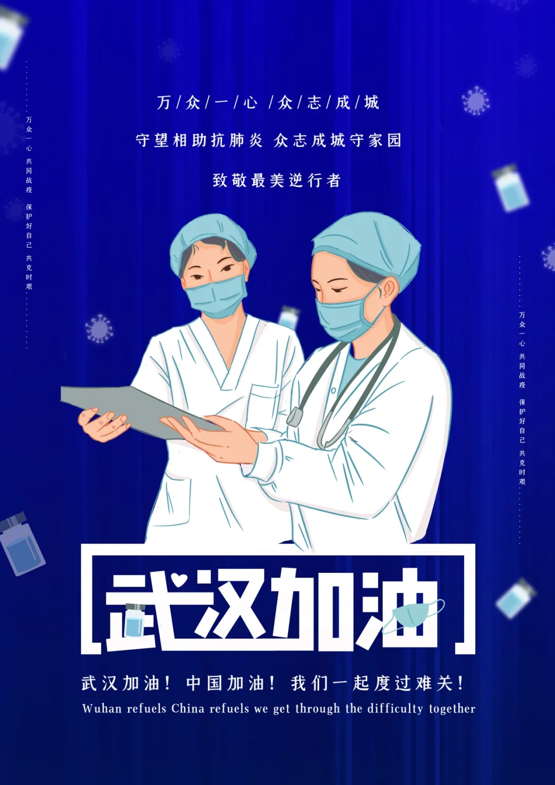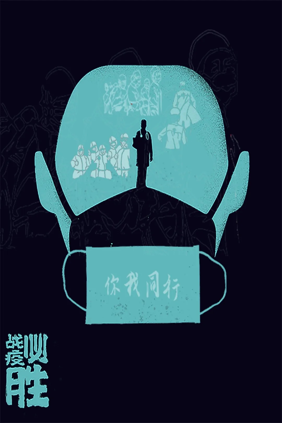 创作感想:这次“艺术战役,你我同行”的活动,给了我们一个能表达自己对医护人员的崇高敬意的平台。所以海报上出现的是医生与护士,他们与我们一起共克时艰。背景采用蓝色,而主画面使用白色刚好对应医护人员的白大褂和蓝色的帽子口罩。我们的专业虽然不能上前线治病救人,但是我们可以用自己的方式给医护人员加油。