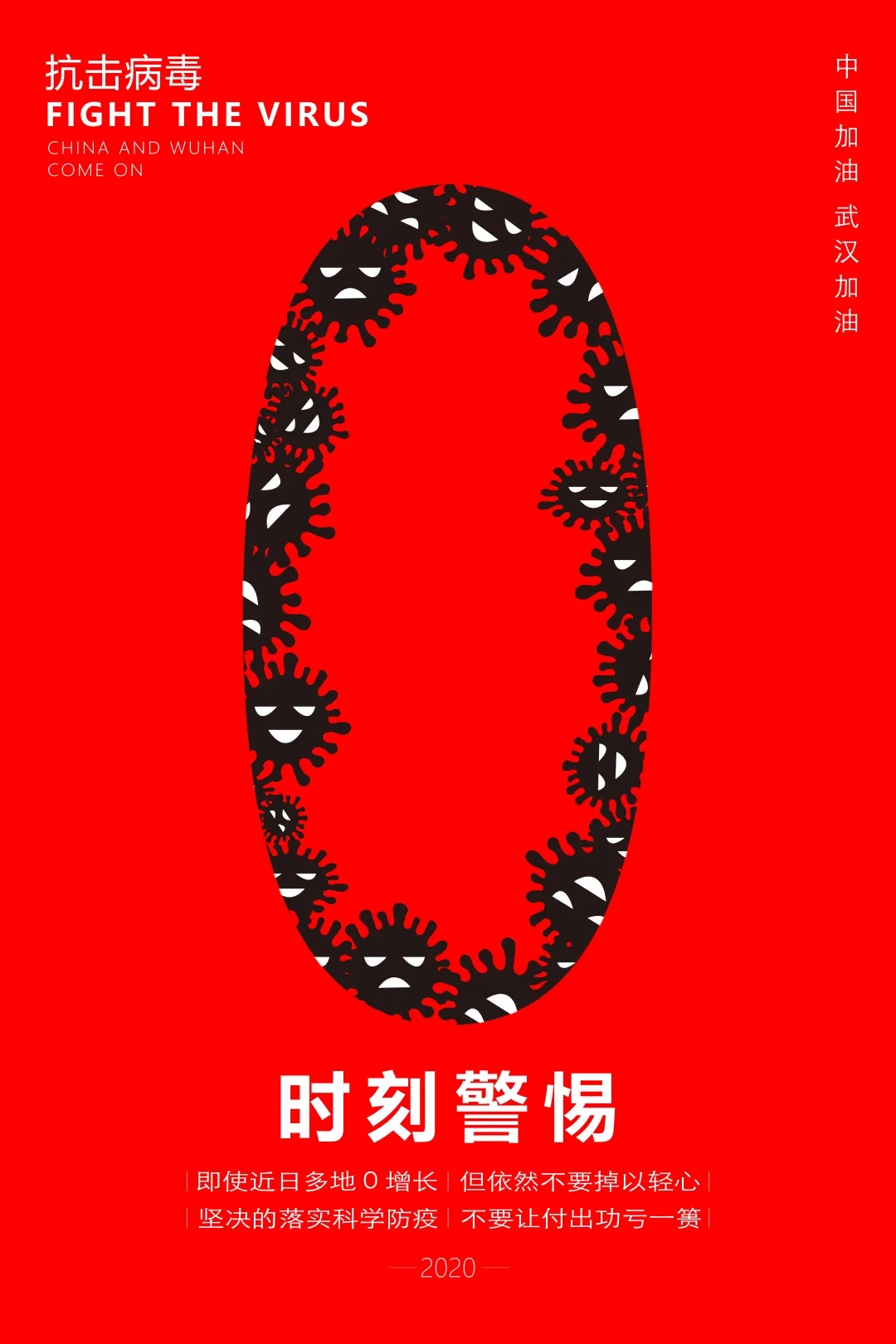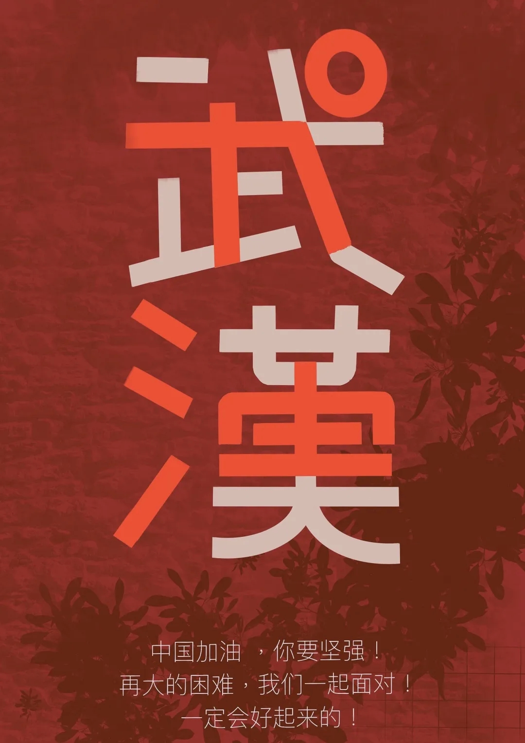 创作感想:我采用了各个省份来代表一个大家庭,这些大家庭同时汇成了武汉这座英雄城市,我所选择的颜色也是英雄红色,这个颜色代表着正义,坚强,壮悍,同时也代表着中国一线的医护人员,军人,和许许多多的同胞们一起努力的成果。在这个题材上并没有选取过多的技巧,主要是把中心的武汉用各个省份拼接起来,以及背景用红白凸显中心的关键主题,这幅作品也主要是以文字的形式和表达去展现,用文字的黑白灰关系和叠压关系做出了比较强的对比关系和中心主题。