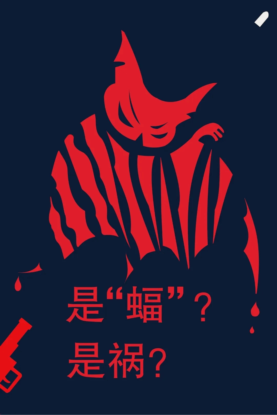 创作感想:这是我为这次疫情所创作的一幅作品,我把它命名为《是“蝠”还是祸?》。祸兮福所倚,福兮祸所伏是——《老子》,福与祸并不是绝对的,它们相互依存,可以互相转化,这是来自古语中的一句话。“蝠”还是祸,蝙蝠的蝠与福谐音相同,又是新冠状病毒的最重要的传染源头。左下方的枪象征医护人员手中的针筒,被视作为武器,打破“蝙蝠”,打碎“蝙蝠”,从而获得这场抗击疫情攻坚战的胜利。