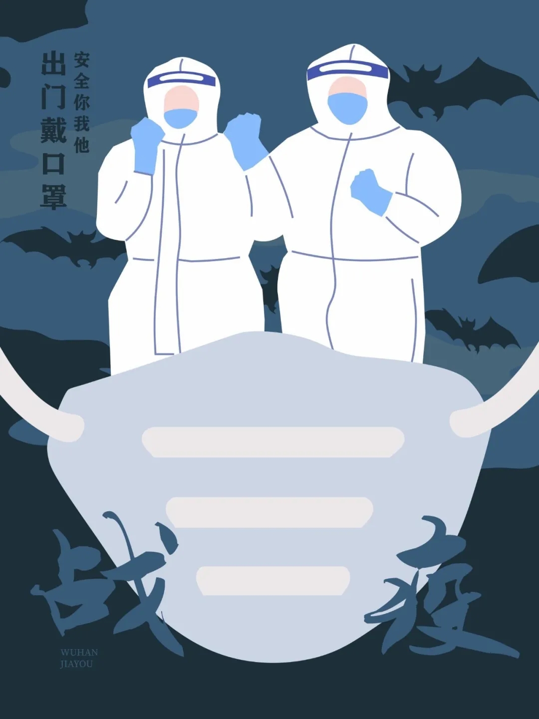 创作感想:为了维护人民群众生命安全和身体健康,坚决遏制疫情蔓延势头,故做了此张海报用作宣传科学防疫知识。此张海报采用口罩,蝙蝠,防疫人员等自创矢量元素以及手写字体设计结合起来,并加上科学防疫“出门戴口罩,安全你我他”的口号标语,呼吁人民群众出门戴口罩。背景采用暗色系和蝙蝠元素,着重强调战疫的紧张氛围,呼吁人民群众拒绝吃野味。画面中心是两位防疫人员,手势作加油打气状,以我们全国人民科学防疫之不懈努力奋斗的决心与勇气。下方是一副口罩,利用图画元素简明扼要的,呼吁人们戴口罩。