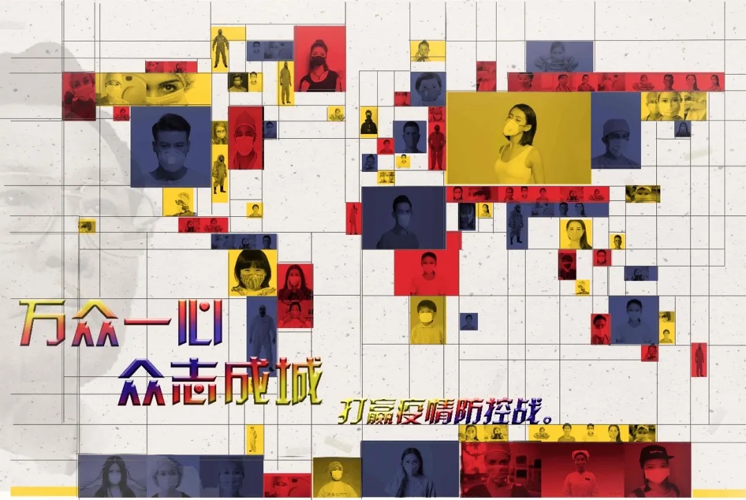 底图为世界地图,呼应“艺术战役,你我同行,”的主题,作品中的“世界”所指的便是“你我”狙击疫情,人人有责,作品后面是一个透明的钟南山头像,以表示钟南山院士为这次疫情付出的贡献,每个红黄蓝的色块的后面都有一个戴口罩的人像,布满整个地球,寓意着全球队员、同舟共济、万众一心、众志成城,共抗疫情。而且本次作品的主要色调为暖色调,是憧憬着气候渐暖,春回大地,万物复苏!希望真正的“春天”早日到来!