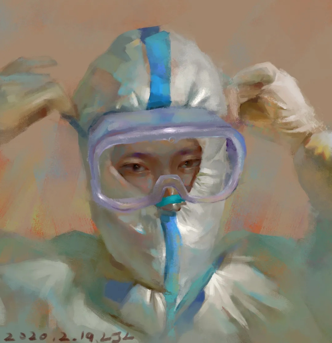 创作感想:在一张张一线照片中的一个个坚决的眼神感动了我,而一张正在佩戴装备的医生吸引了我,因此创作了这张。在疫情期间,一线人员背着可能被病毒夺取生命的危险,奋力前行,一往无前的扎进那湮没的深渊在黎明的曙光再一次亲吻你我之前,请无数个你和我,待在家里。