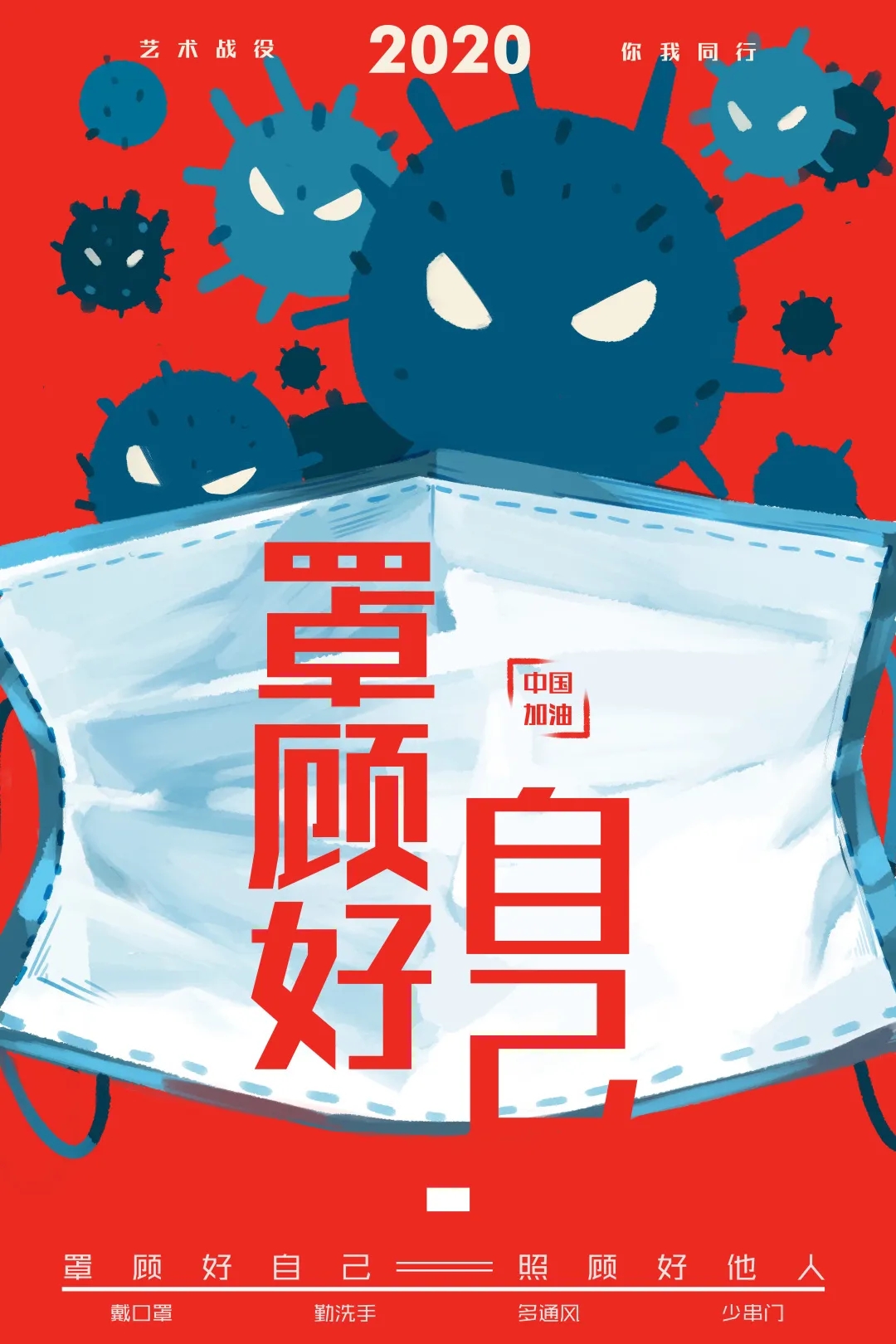 创作感想:海报主体是由一个正面朝向的口罩面向观者,口罩背面则是成群的病毒。主要是提醒观看者,病毒到处飘荡,要戴好口罩。主题字用高饱和度的红色和冷白的口罩形成鲜明对比,增强视觉冲击力,而位置放在整个画面的3/2,是最吸引人观看的位置,字体用较粗的非衬线体,可以给人一种比较正式有力量的感觉,同时凸显主体字,符合整个画面风格。病毒用暗蓝色,凸显它的邪恶性,同时和红背景形成对比,有一定的视觉冲击。整个海报版面采用居中对齐方式,一是可以更容易使画面整体,不乱。二是符合海报主题的严肃正式性。