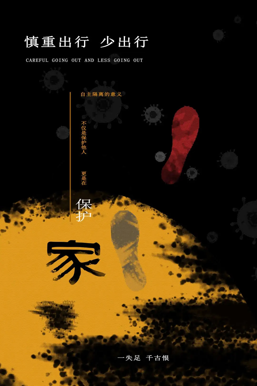 创作感想:海报受启发于明朝杨仪《明良记》中 “一失足成千古笑,再回头是百年人。” 这个故事比喻一旦犯下严重错误或堕落,就成为终身的憾事。海报主体是由脚印(一红一黑)、家(被毁掉的黄色部分)与新型冠状病毒构成;脚印、家与新型冠状病毒三者之间存在必要的联系,《足迹》海报旨在传递在这次战疫面前,请务必慎重出行,少出行,宅在家里,与白衣天使们共同抗疫,是对一线医护人员最大的支持,对社会做最大的贡献;宅在家里隔离的意义不仅仅是在保护他人,更是在保护自己的家,也莫给在前线奋战的白衣天使们添乱。