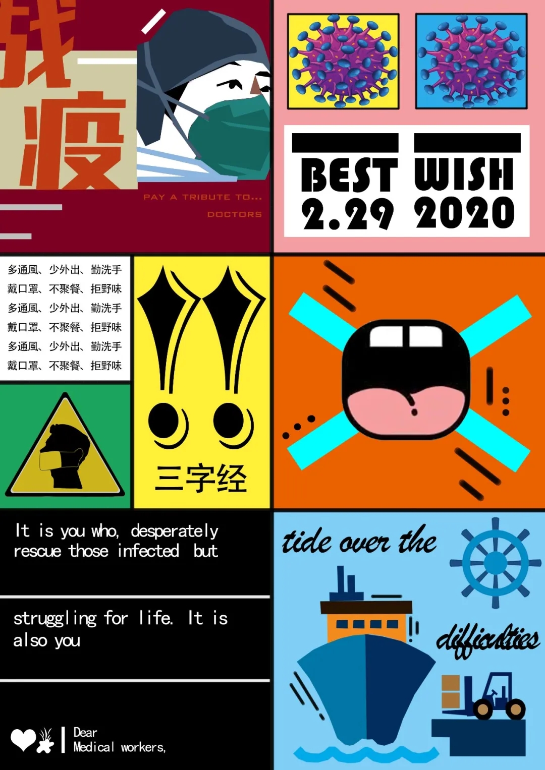 创作感想:我的战疫作品分为六宫格,用鲜艳的色彩表达我对医护人员的敬意和衷心的祝愿。格一:是战役先锋的代表。格二:是对早日战胜病毒的期许。格三:人人流传明白的三字经。格四:病从口入,拒绝野味,并带好口罩。格五:是写给医护人员的一封信。格六:共渡难关,同时致敬运送物资人员 。