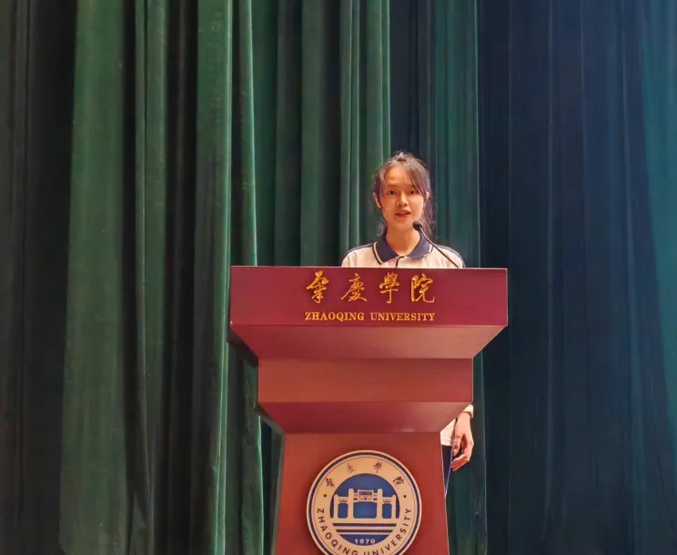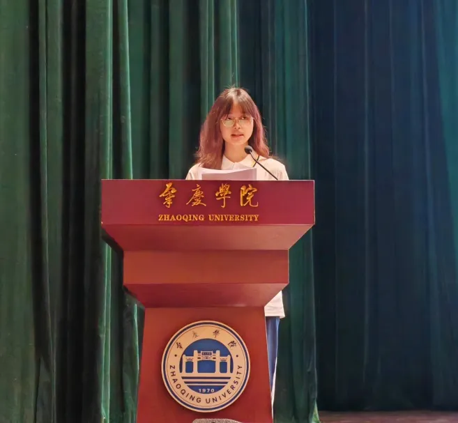 2021级美术学1班黎虹麟作为员工代表致辞。她以自己顺利成为中共党员、成功斩获国家奖学金、顺利完成援藏支教队任务等经历为例向新生分享了经验:做好合理规划,确定奋斗目标;学好专业知识,积极动手实践;培养兴趣爱好,助力全面发展。