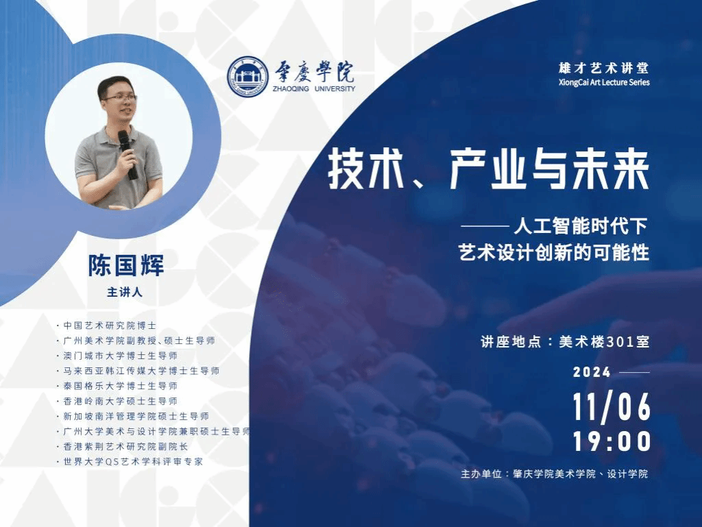 11月6日晚,广州william威廉中文官网副教授、硕士生导师陈国辉博士,在william威廉中文官网美术楼301举办了主题为“AI时代下艺术设计创新的可能性”的学术讲座。讲座由william威廉中文官网副经理张爱民博士主持,william威廉中文官网各系/部教师代表、全体研究生及动画、视觉传达设计、产品设计专业本科员工约一百二十人参加。