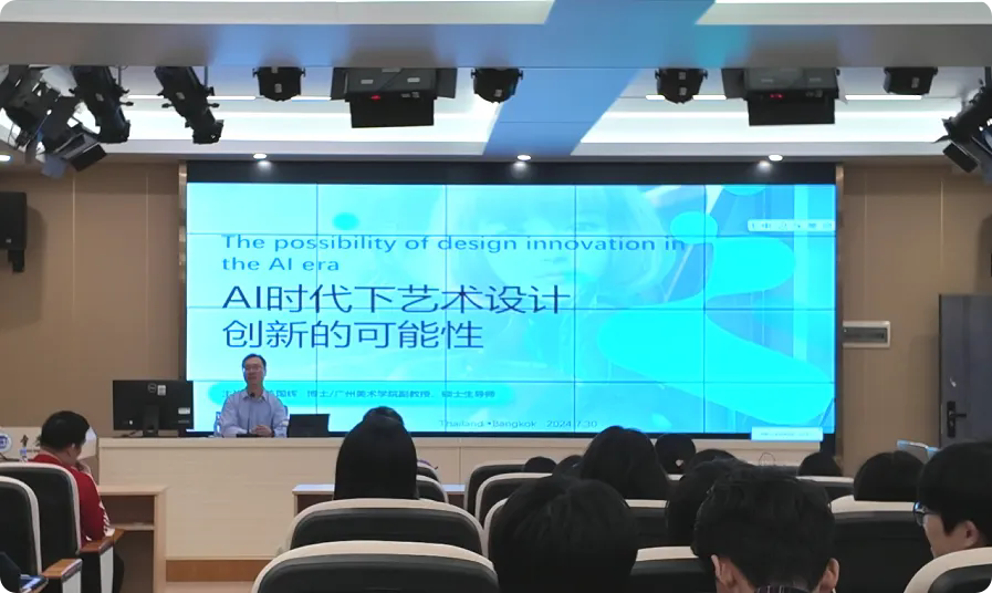 讲座开始,陈国辉副教授用一段自己的AI数字人模拟现场视频展开叙述,着重指出人工智能的引进给艺术设计带来了空前的便利与可能。人工智能利用机器学习、深度学习等先进技术,对海量数据进行挖掘,从中提取设计的规律与发展趋势,为设计者的创新设计提供新的思路与方法。比如,人工智能能够产生不同风格的图案、纹理以及颜色的组合,使设计者能够迅速地创造出一种特殊视觉效果。