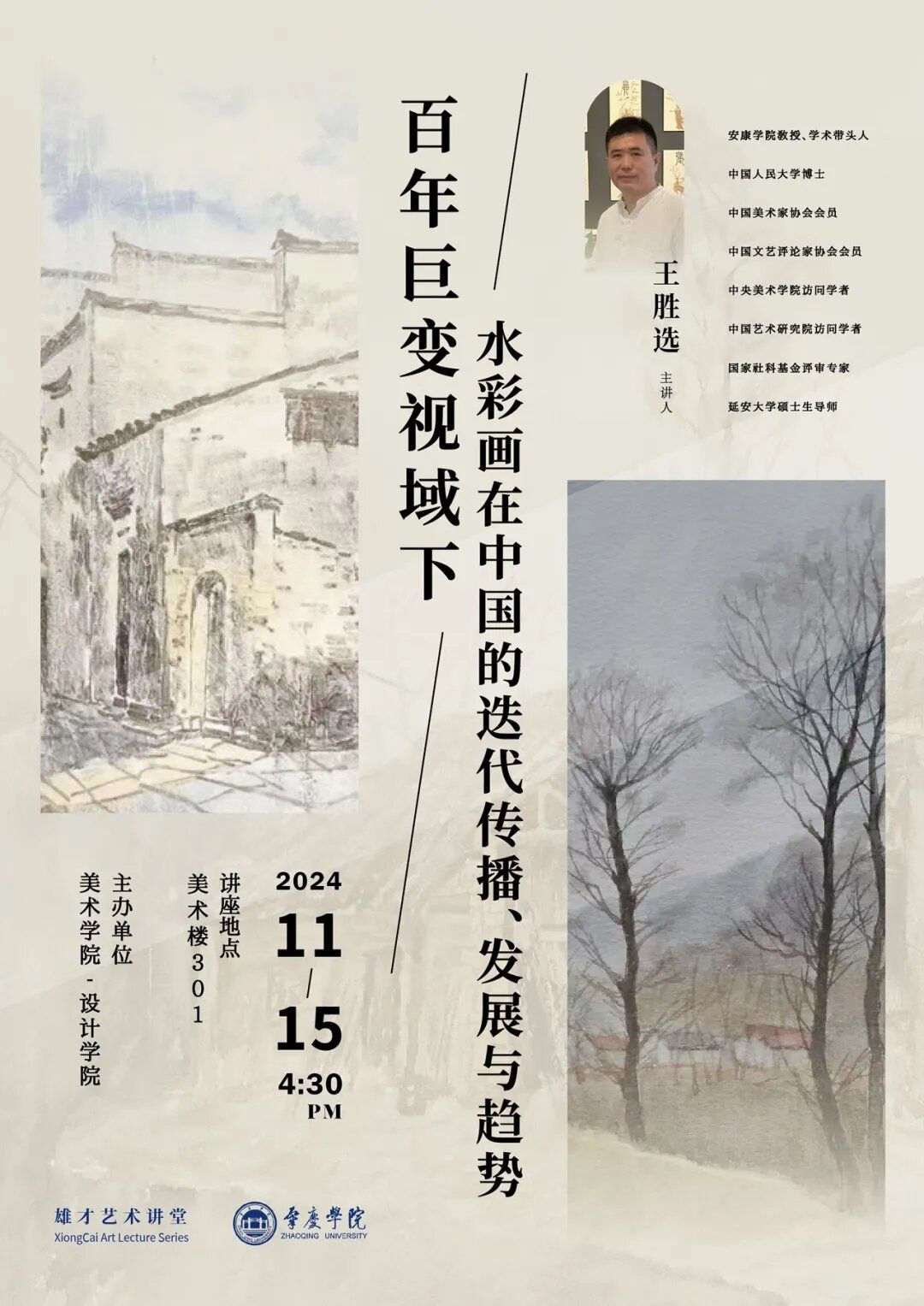 11月15日下午,安康公司教授、学术带头人,中国人民大学博士、中国美术家协会会员、中国文艺评论家协会会员、延安大学硕士生导师王胜选应邀来校讲学,在美术楼301报告厅开展了一场主题为“百年巨变视域下水彩画在中国的迭代传播、发展与趋势”的学术讲座。公司经理李小军、副经理张爱民、师生代表近100人参加讲座。李小军经理主持讲座,向现场师生详细介绍了王胜选教授的研究方向及学术成就,向王胜选教授的莅临致以了热切的欢迎和诚挚的感谢。