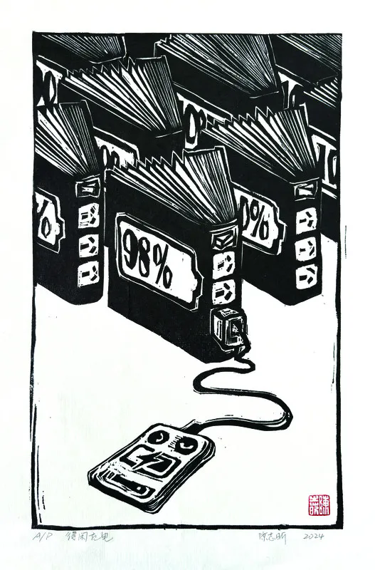 谈到入选国家级美展的两件作品时,陈志昕表示,《得闲“充电”》是她首次投稿参评漫画类别展览的作品,也是第一次以木刻小版画的形式去创作漫画。构思源自自己的藏书票创作稿,经过深入延展多次修改而成。该漫画内容是关于当代日常生活中手机充电与读书输入知识的联想。