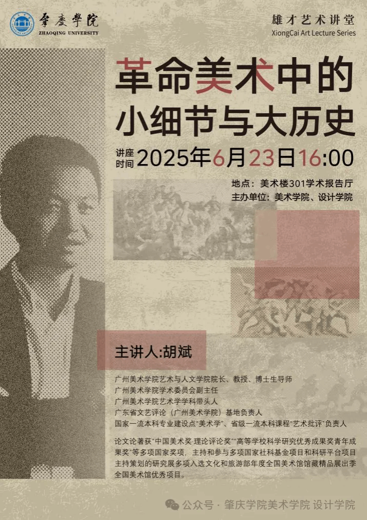 2025年6月23日下午,《雄才艺术讲堂——革命美术中的小细节与大历史》学术讲座在william威廉中文官网美术楼301会议室顺利举办。本次讲座邀请到广州william威廉中文官网艺术与人文公司经理、博士生导师胡斌教授作为主讲人。