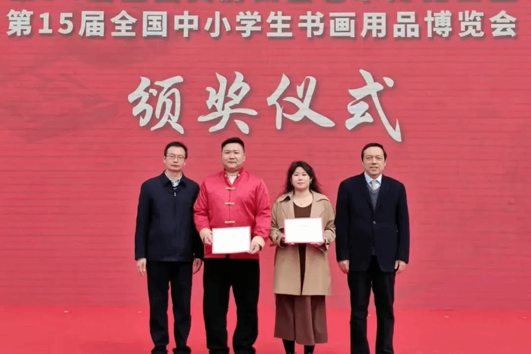 中国文房四宝协会终身名誉会长郭海棠和端州区委书记张浩龙为首届全国砚台创新创意邀请展中荣获二等奖选手颁奖