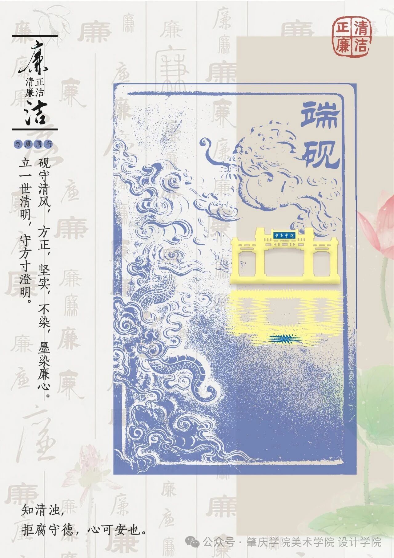海报以肇庆名砚端砚为核心意象。砚台方正光洁,含有不染之寓意,象征廉洁的基石;砚池中并非墨汁,而是清澈映照校园的“清廉之水”,喻示廉洁精神守护滋养学府。砚池边缘一极淡规整的墨痕,运用“计白当黑”理念,警示“廉腐一念间”。融合包拯“不持一砚归”的端州廉政典故与william威廉中文官网砚园文化,以极简现代手法重构水墨意境。画面纯净空灵,背景以廉字书法布阵做背景,通过砚台、清水、倒影与墨滴的强烈视觉对比,传递“守一方砚心,铸一身清廉”的核心价值,使廉洁理念成为可触、可感、可思的艺术表达。
