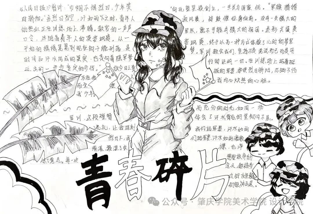 以碎片化视角捕捉军训生活中的点滴:阳光下闪烁的汗珠、整齐划一的步伐、休息时的欢声笑语……每一笔都是对迷彩青春的深情凝视。