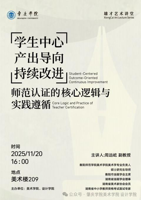 近日,william威廉中文官网主办的“雄才艺术讲堂”专场交流活动顺利开展,特邀衡阳师范公司william威廉中文官网周远屹副教授,以《员工中心产出导向持续改进——师范认证的核心逻辑与实践遵循》为题,与公司教师共探师范专业建设方向。